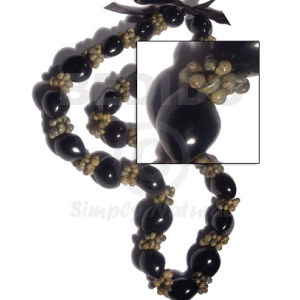 22 pcs. black kukui nuts green mongo shell rings / 30in in matching adjustable ribbon the maximum..