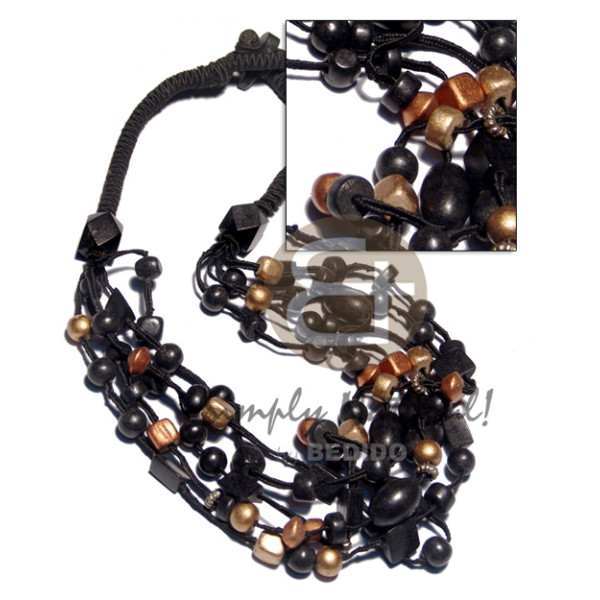 5 graduated layers black satin cord black and metallic gold asstd. cuts nat. wood beads in accent..