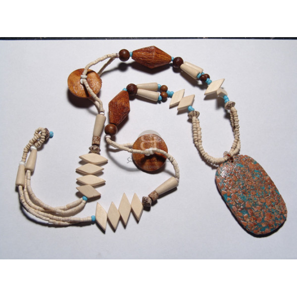 tribal carved 50mmx18mm wooden pendant coco Pokalet/wood beads accent in double wax cord / 23in...