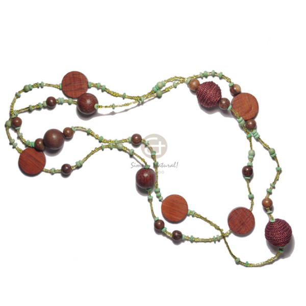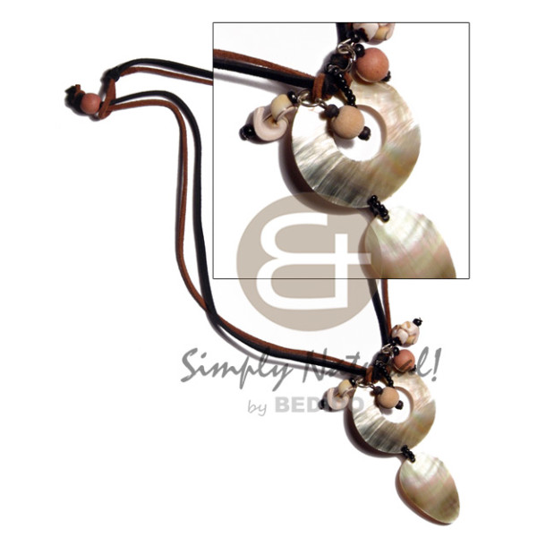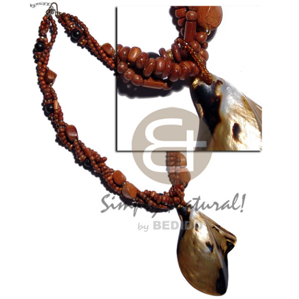 45mm brownlip blocking pendant in 2 rows 2-3mm coco heishe bleach/buri & wood beads combination..