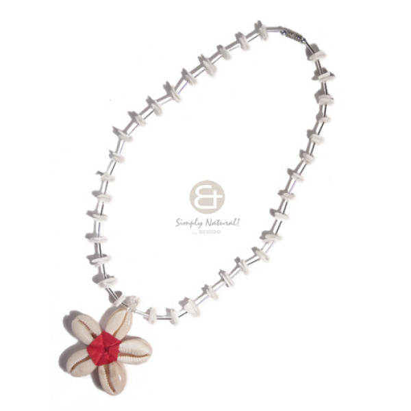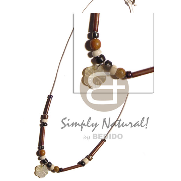 wax cord coco Pokalet/wood beads/bamboo 15mm MOP floral pendant..