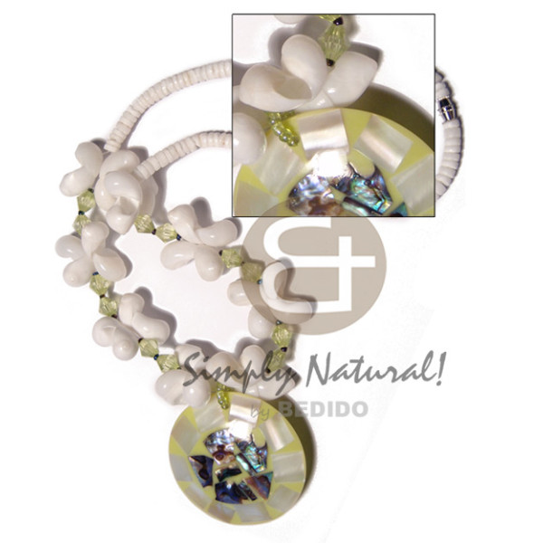 4-5mm white clam heishe moon shells / green acrylic crystals combination and 50mm round neon green..