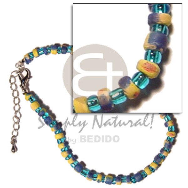 green 4-5mm coco Pokalet./white clam heishe/wood bead and yellow coco splashing 4-5mm coco heishe..