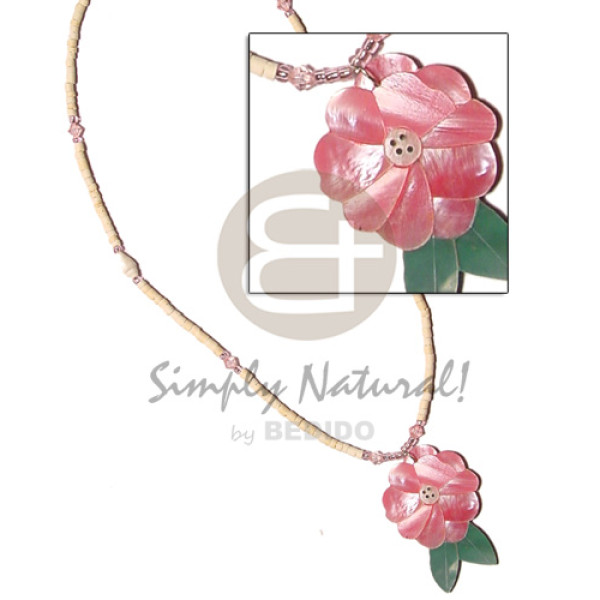2-3 coco heishe beads pink acrylic crystals and inlaid hammershell rose pendant..