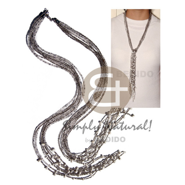 scarf necklace - 7 rows black/tclear glass beads tassled white mongo shells / 36 in...