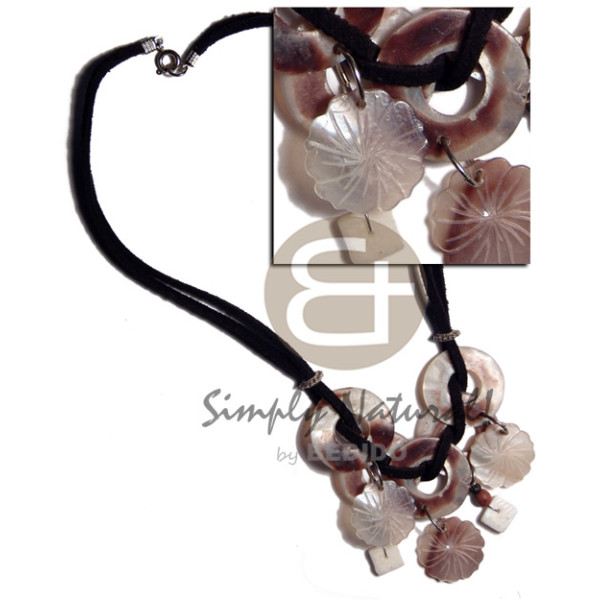 25mm ring hammershells dangling 20mm hammershell flowers in double leather thong wood beads accent..