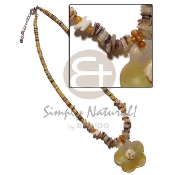 yellow hammershell heishe buri seed, horn beads & sq, cut shell accent 40mm scallop MOP cowrie sh..