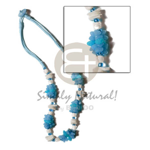 aqua blue 3 layer wax cord buri seeds, shell & white rose beads combination..