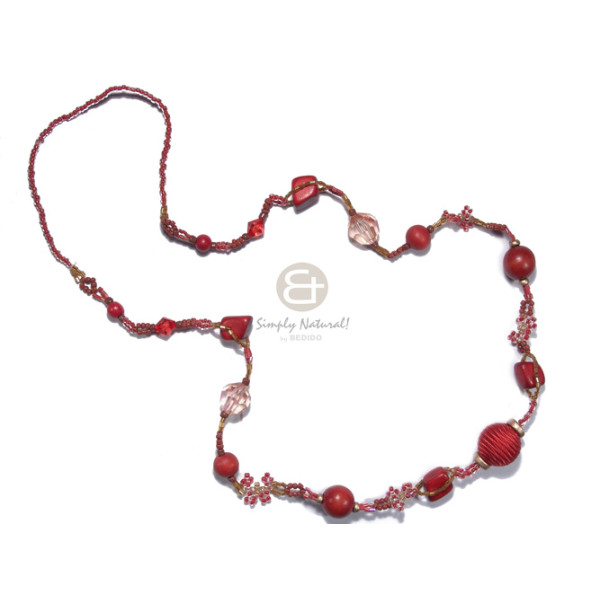 dark red and amber glass beads matching dark red wood beads, acrylic crystals combination / 32in..