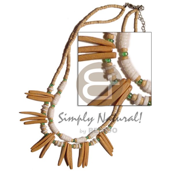 2 rows 2-3mm coco heishe nat. white clam,indian sticks & green beads combination..
