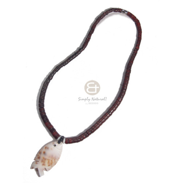 graduated coco heishe in dark marron tone cowrie tiger shell/50mmx25mm fish design pendant /16in..