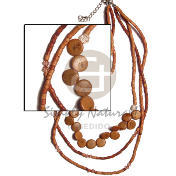 3 rows graduated tan 2-3mm coco heishe/Pokalet sidedrill coco and acrylic crystals..