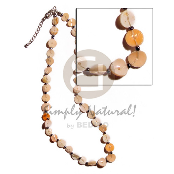 3 rows raffia in graduated length 21 pcs. round 18mm orange hammershell and glass beads accent..